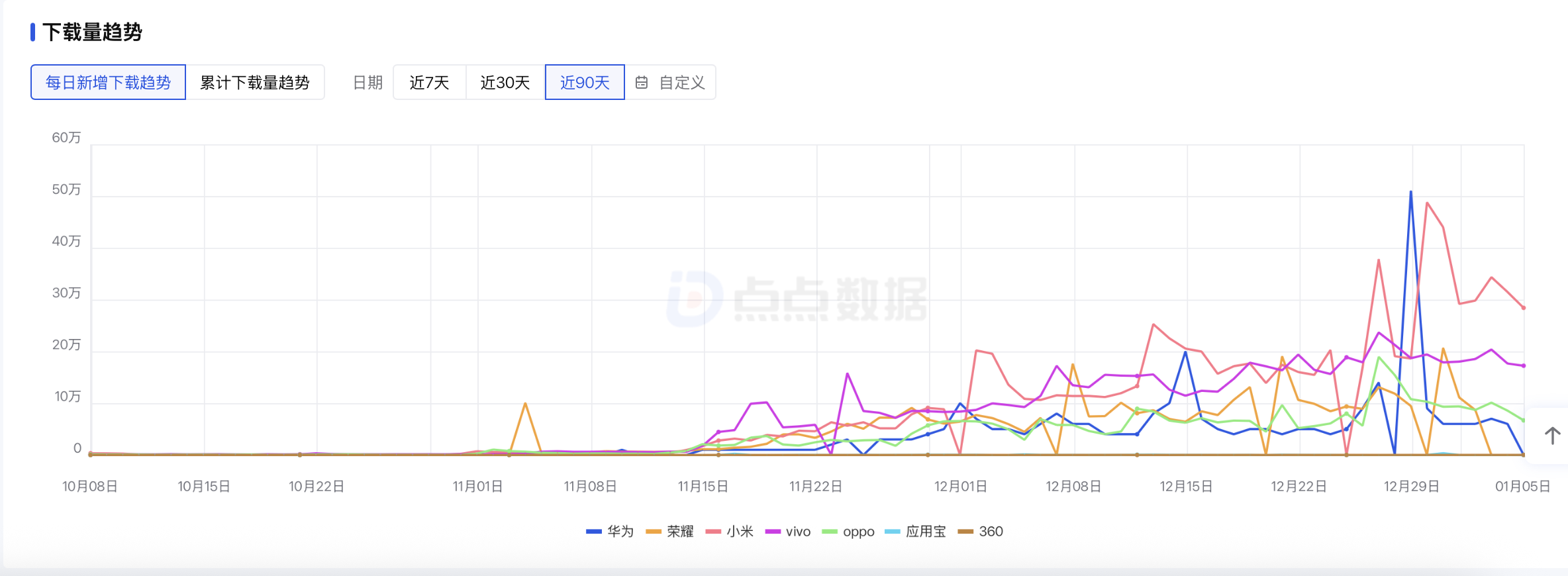 下载量方面,据点点数据,目前红果免费漫剧在安卓端应用商店累计下载量 超2587万 ,近30天日均下载量 接近60万 。其中小米下载量达 819.6万 ,vivo下载量达 725万 ,荣耀下载量达 379.3万 。