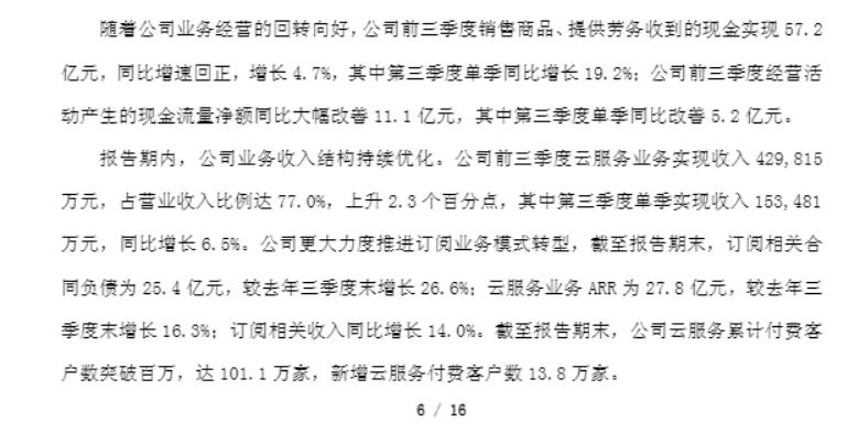 财报显示,今年前三季度其云服务收入43亿元,占营业收入比例达77.0%,上升2.3%;其中第三季度单季实现收入15.3亿元,同比增长6.5%。