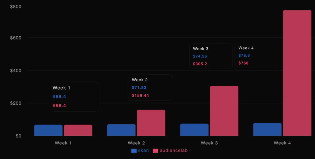 案例显示,由于能够实时暂停无效创意并测试新创意,Audiencelab表现优于SKAN12倍