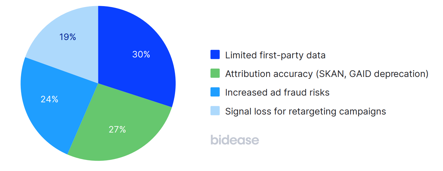 《2025移动应用增长调查报告》显示,在移动营销团队面临的最大挑战中,30%的受访者将“有限的第一方数据访问”列为首要问题,而“归因准确性不足”也占到26.5%。这意味着在隐私环境下,广告归因的不可靠性已经从技术困扰变成普遍痛点,并且在优先级上已经超过一些传统的优化问题。
