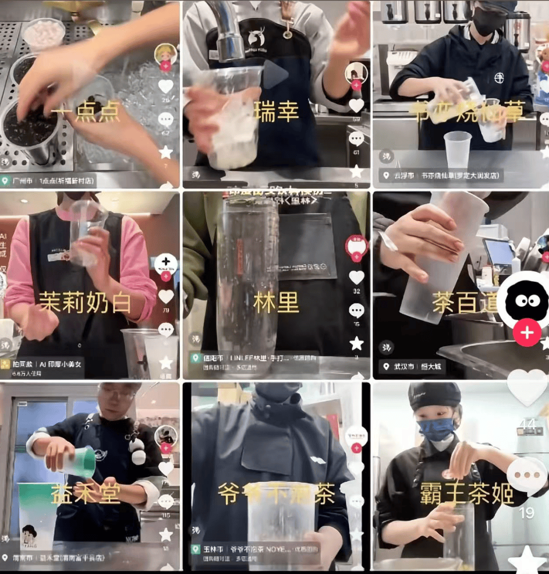 “徒手做奶茶这个梗,霸王茶姬跟得还算晚的。”刘芸对「市象」表示,瑞幸、茉莉奶白、1点点等知名品牌均有员工拍摄过类似视频。