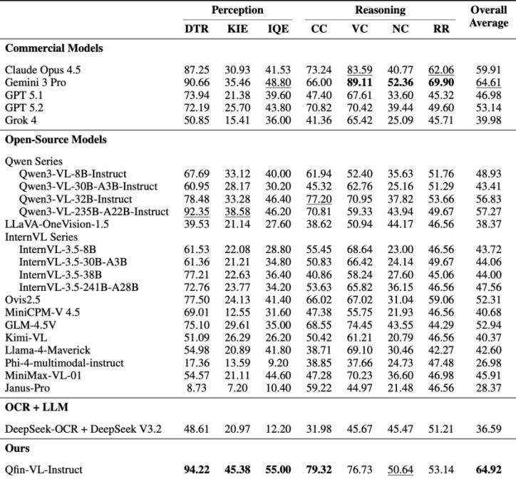 通过对23个主流多模态模型的全面评测,FCMBench展现出了专业的鉴别能力。在FCMBench的首轮评测中,谷歌的Gemini 3 Pro(64.61)位列商业模型榜首,阿里云Qwen3-VL-235B(57.27)成为最佳的开源基模。基于奇富实际业务场景研发的信贷垂类多模态大模型,Qfin-VL-Instruct以64.92的F1分数斩获综合第一。
