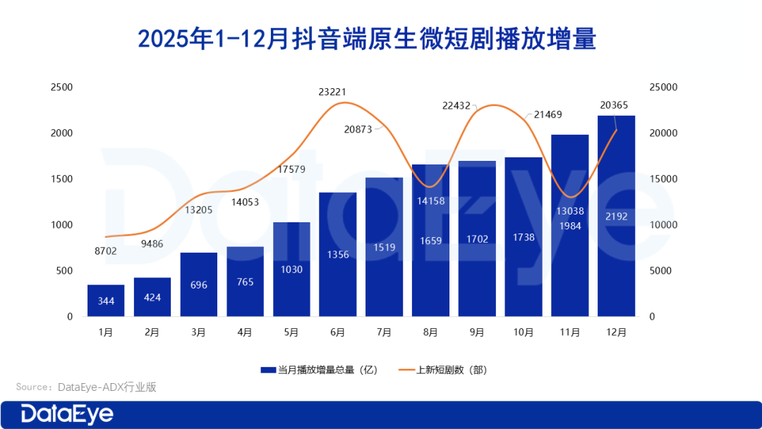 2025年端原生微短剧市场播放量实现全年爆发式增长,播放规模一路攀升,月度播放增量从343.62亿狂飙至2192.04亿,增长势头强劲。