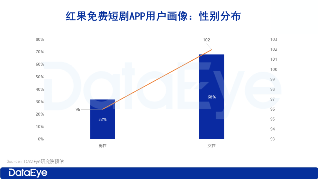 从性别分布来看,红果短剧的女性用户占比高达68%,男性用户占比为32%。和市场大盘相比,红果短剧女性用户占比大幅领先。