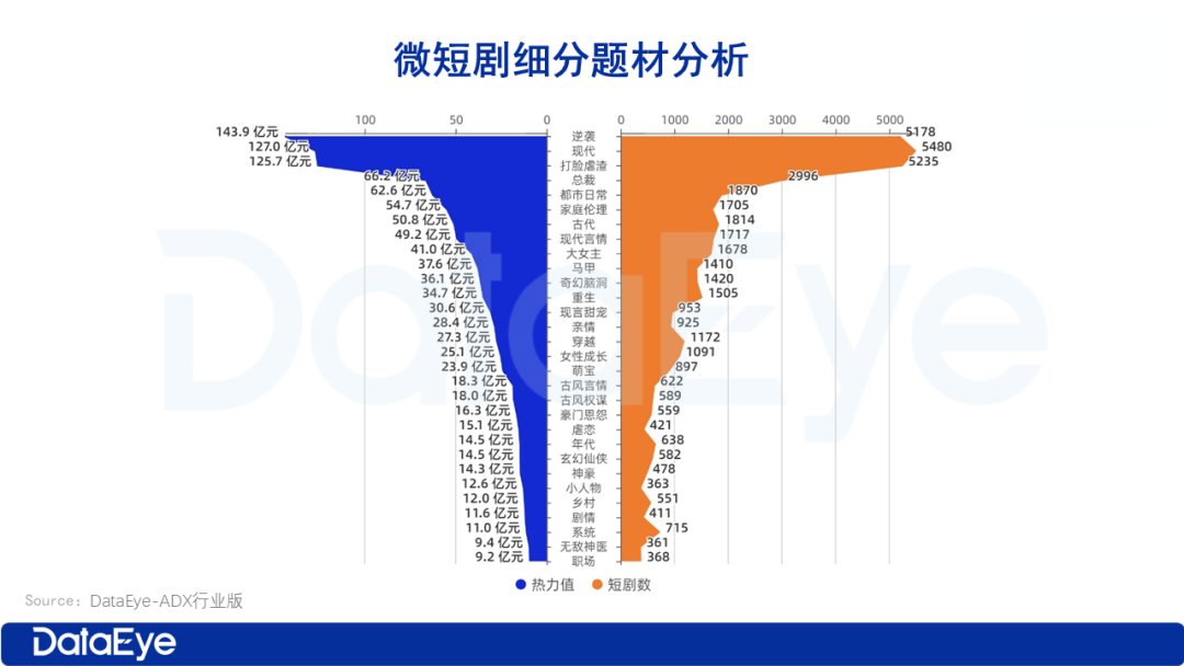“逆袭”题材热力值达143.9亿,短剧数达5178部,在“热度规模”和“作品数量” 上均为绝对第一,是微短剧最核心的赛道。