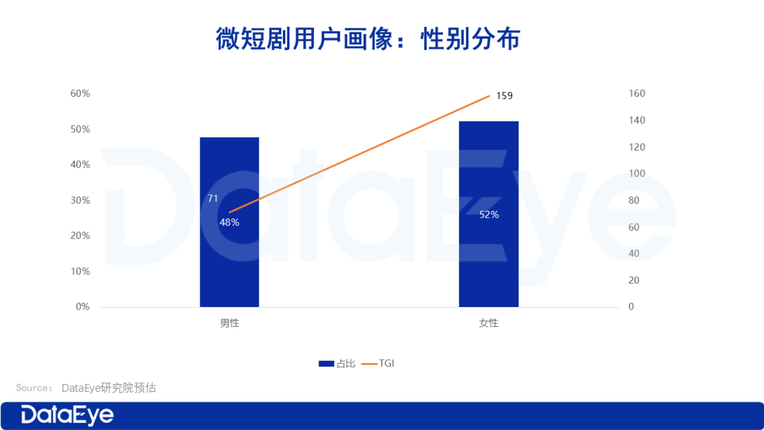 值得关注的是,女性用户的偏好度(TGI)高达159,而男性用户仅为71。这意味着女性用户对微短剧的偏好程度与使用粘性均远高于男性群体。