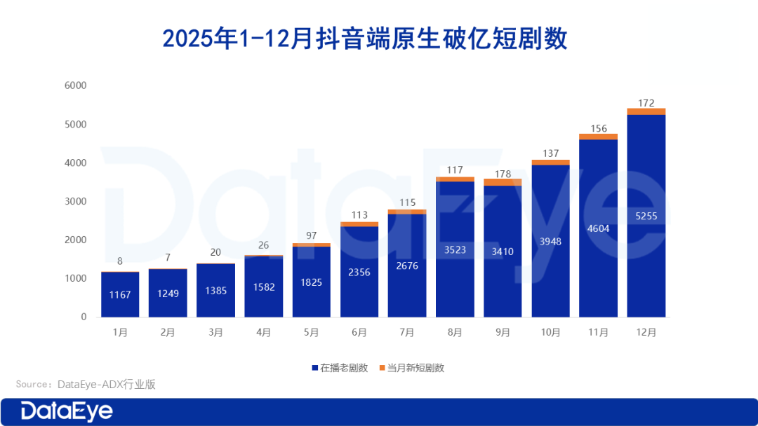 抖音端原生累计播放量破亿的微短剧中,短剧数从1月的1175部持续增长至12月的5427部,整体呈稳步上升态势,说明抖音端能达到“亿级播放量”的微短剧规模在不断扩大。