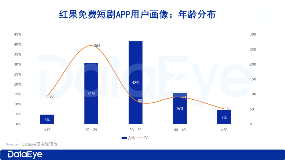 从年龄分布来看,红果短剧用户群体更为年轻化。具体数据显示,40 岁以下用户合计占比超七成,成为平台的核心受众群体。其中,30岁以下用户占比达36%,远超全市场该年龄段1/4的平均水平;而50岁以上用户占比仅为7%,占比相对较低。