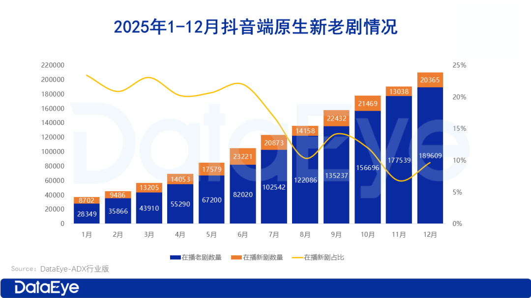 从整体趋势来看,抖音端原生微短剧市场极速飙升。2025年全年,在播微短剧数量突破20.48万,创历史新高;在播新剧数超18.5万部,占比约90%。