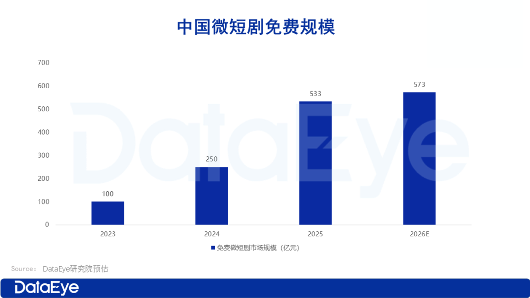DataEye研究院预估:2025年中国免费微短剧市场规模约533亿元,较2024年同比增长113%,免费短剧模式在整个微短剧市场中的占比将达到 2/3左右,主要由于: