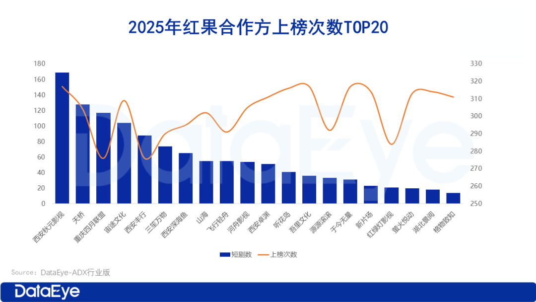 DataEye-ADX数据显示,从上榜短剧数来看,西安秋元(169部)、天桥(128部)和重庆四月联盟(117部)包揽TOP3,均是年度“高产王”。