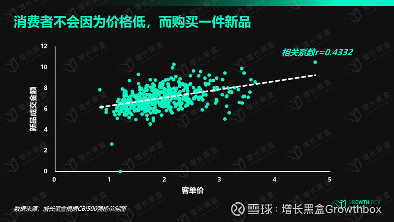 我们将500个上榜品牌的客单价与新品成交金额做了相关性分析,两者的相关系数为0.43,相关性并不显著。这意味着,消费者并不会因为价格低,而购买一件新品。