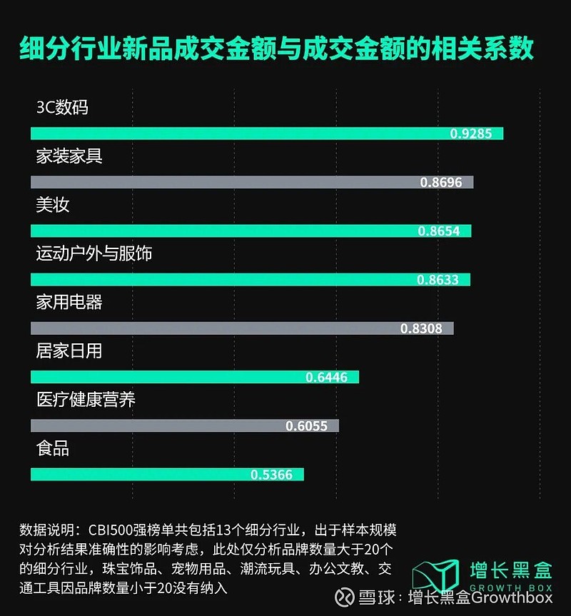 因此,我们选取榜单中品牌占比最高的5个细分行业——运动户外与服饰(145个)、食品(60个)、居家日用(60个)、美妆(56个)、3C数码(46个),将其新品成交金额和成交金额进行相关性分析,发现3C数码行业的相关性最强,相关系数高达0.93,后依次为美妆(0.87)、运动户外与服饰(0.86)、居家日用(0.64)、食品(0.54)。