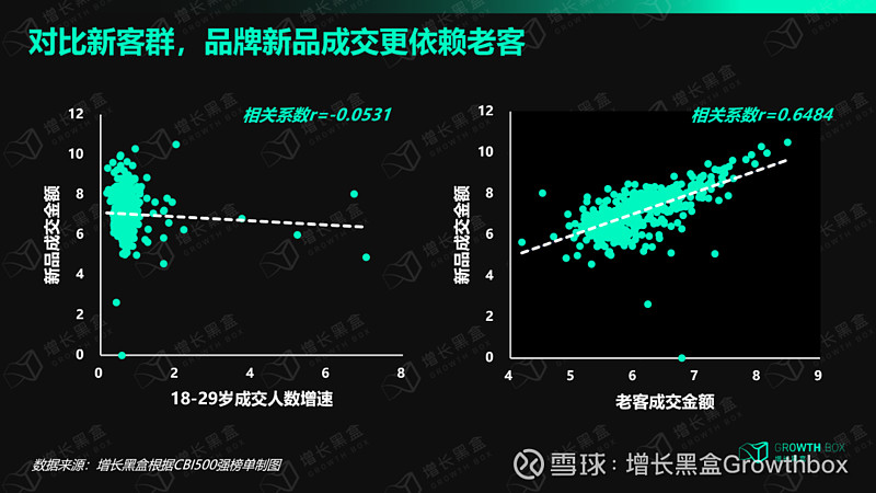 相反,当我们将新品成交金额与榜单中另一维度——老客成交金额进行相关性分析,却发现两者呈现意想不到的强相关。也就是说,对比新客群,品牌的新品成交更多是由老客户贡献。