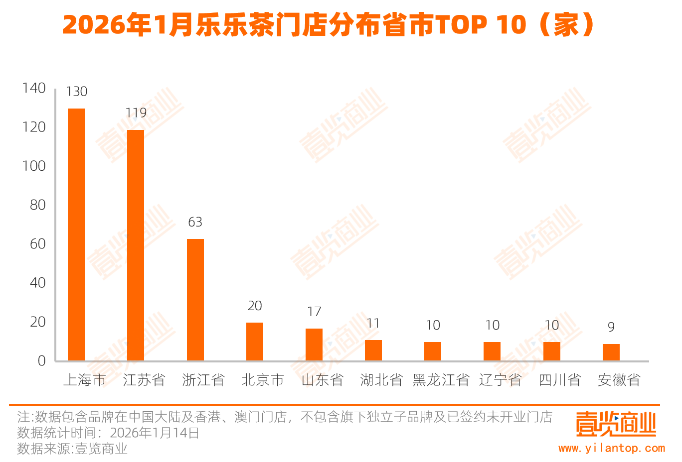 从地域布局看,乐乐茶的456家门店已覆盖全国27个省市,以上海和江苏为核心。其中,上海门店数量达130家,占总数的28.51%;江苏省以119家紧随其后,占比26.10%。此外,乐乐茶在贵州、吉林、内蒙古、云南、广东等11个省市中,门店数量不足4家,具体到城市,32个城市门店数量仅有1家。