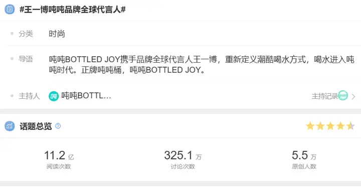 微博话题#王一博吨吨品牌全球代言人#冲上热搜,当日就斩获了超过6亿的阅读量,突破140万讨论数,截至今日(2023年3.23)话题阅读量已经突破11.2亿。
