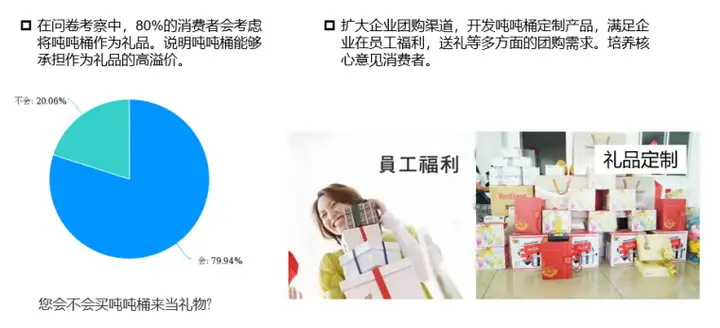 扩大企业团购渠道,开发吨吨桶定制产品,满足企业在员工福利,送礼等多方面的团购需求。培养核心意见消费者。