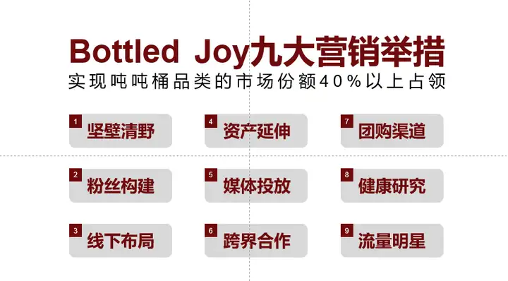 欧赛斯为BOTTLED JOY构建了九大内容策略,目的是实现吨吨桶品类的市场份额40%以上占领。
