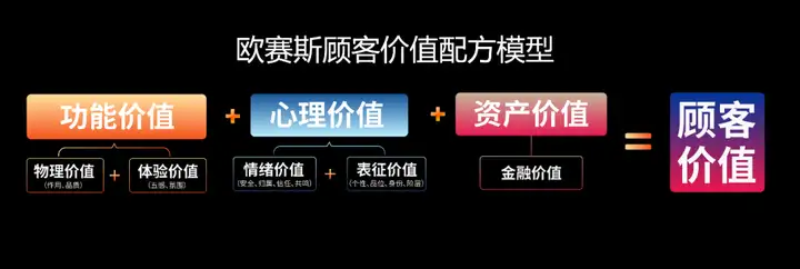 如果产品只卖功能价值,只是一维的产品;叠加了情绪价值上去,就成了二维产品。就如褚橙不仅有黄金酸甜比,而是是“人生总有起落、精神终可传承”。 再叠加表征价值上去,就成了三维产品,就如宝马,不仅是驾驶的乐趣,更是有身份有面子的驾驶乐趣;就如欧赛斯服务的吨吨桶,不仅是一个大容量水杯,更是一个可以晒、可以炫的、可以先朋友圈喝水的大容量水杯。