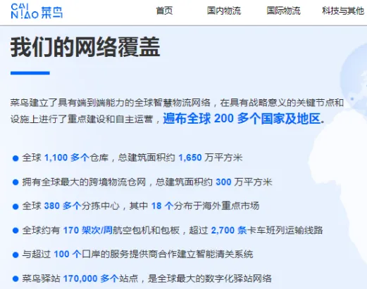 换言之,就是菜鸟不想再国内的物流行业里内卷了,所以毅然决然地选择远征道路。据菜鸟官方网站的消息,其跨境包裹网络已触达200多个国家和地区,拥有18个海外分拨中心,跨境物流仓网总建筑面积超300万平方米……