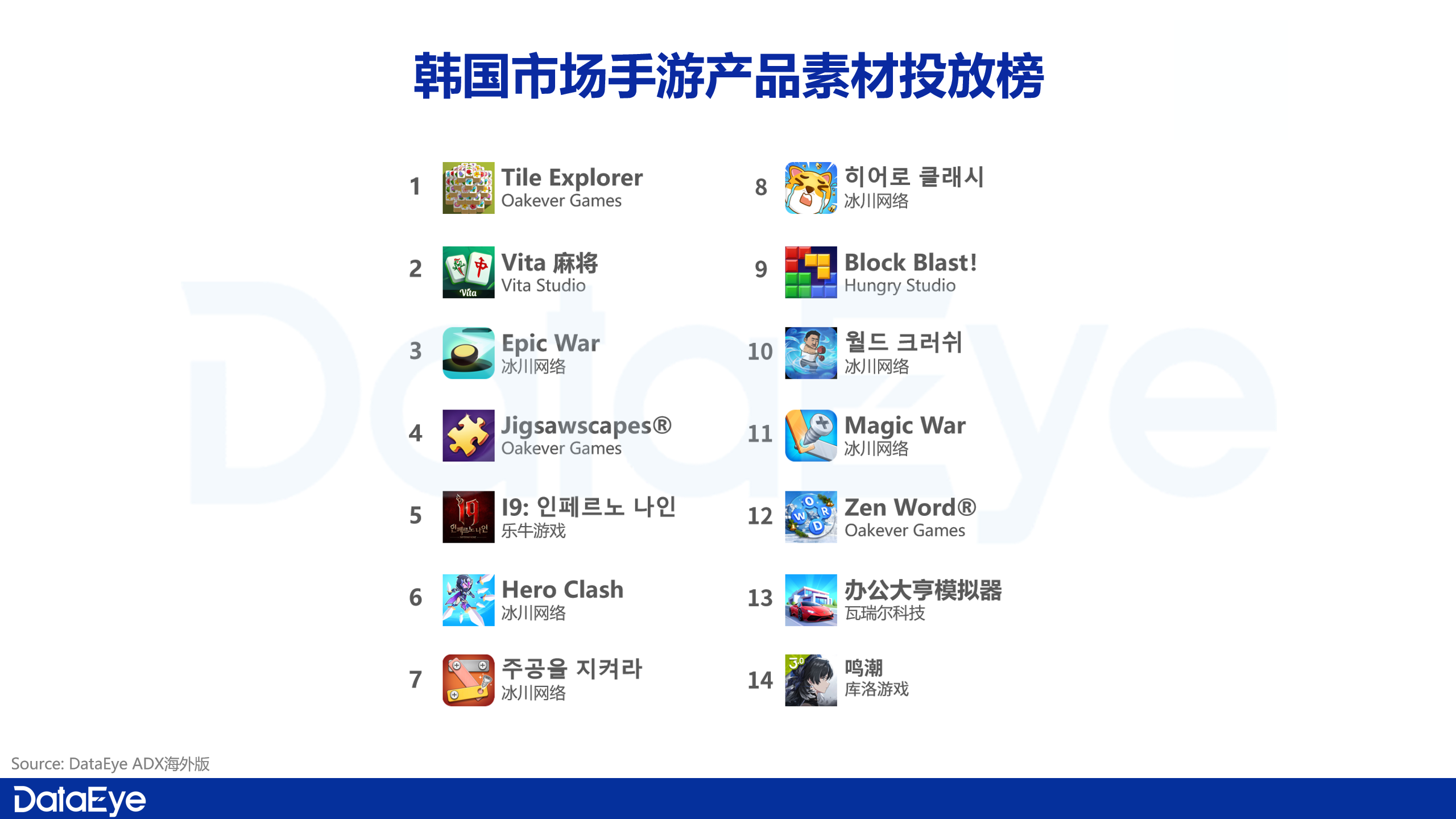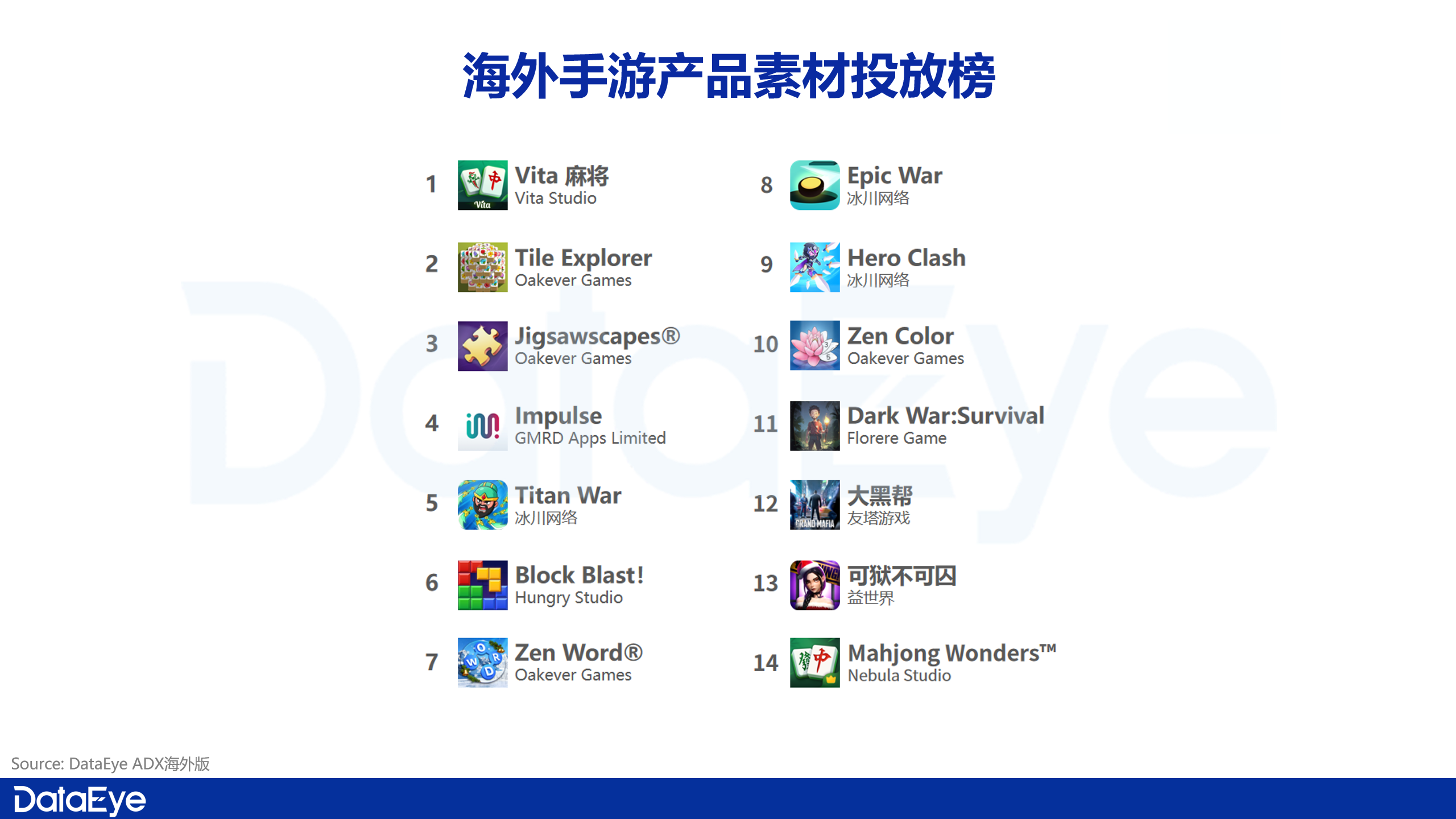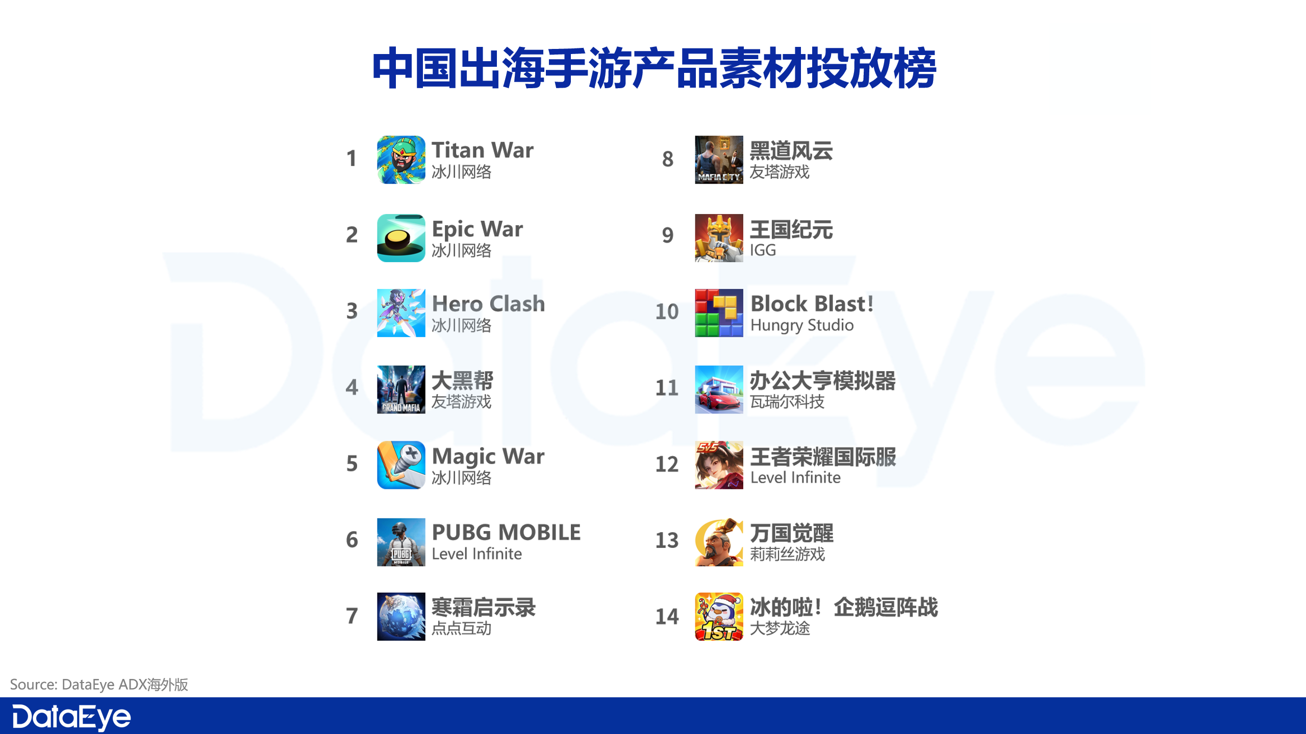 榜单前列以冰川系产品为代表,《Titan War》《Epic War》《Hero Clash》三款游戏均保持在高投放区间。