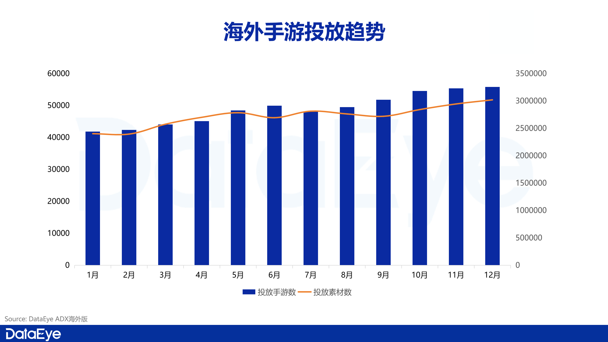 2025年海外手游投放市场呈现稳步上升趋势。全年月均投放手游数约为4.9万款,月均素材量接近275万组。