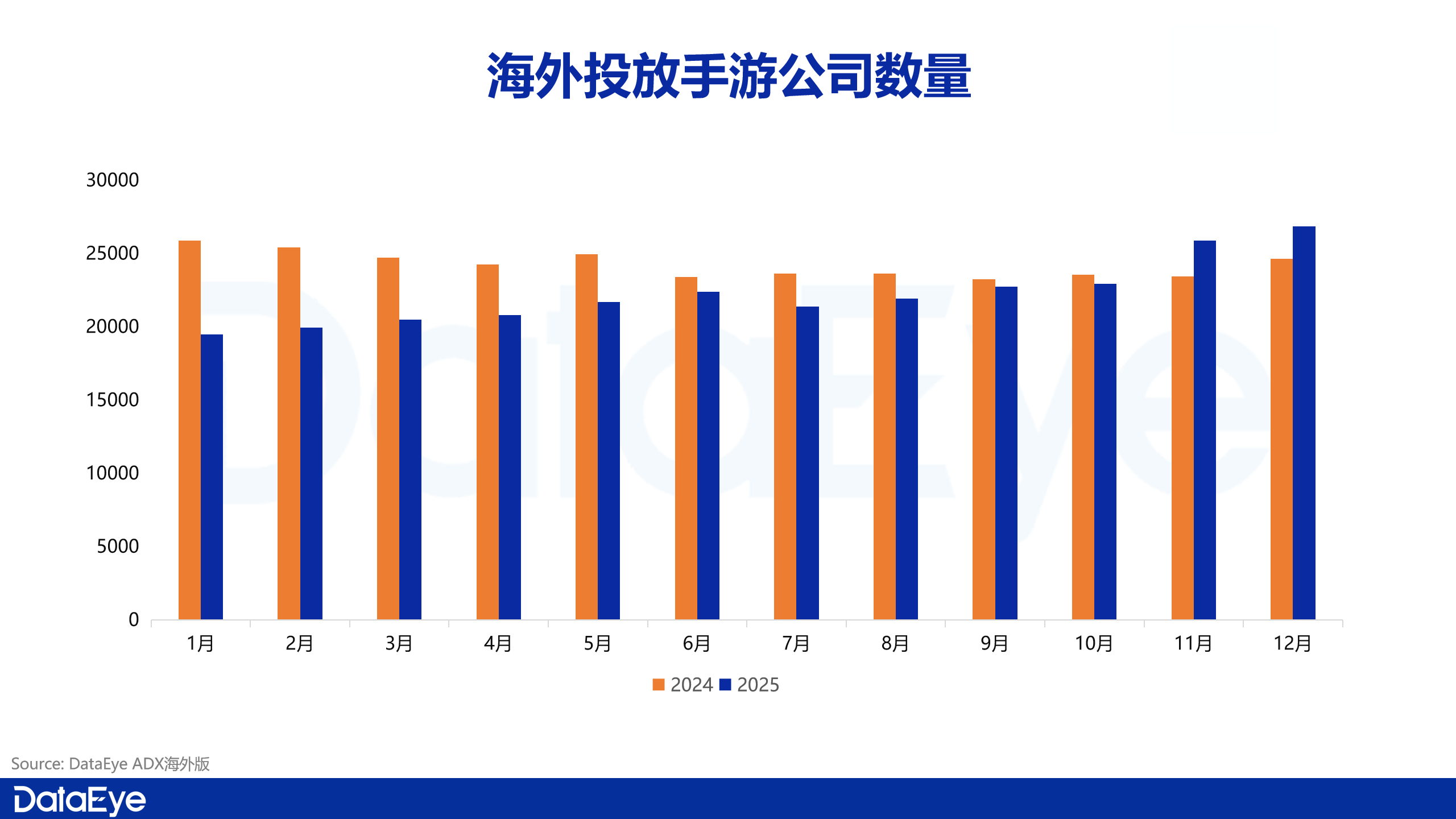 2025年全年海外参与手游投放的公司数量月均约为2.2万家,整体呈现出前低后高、逐步回升的走势。