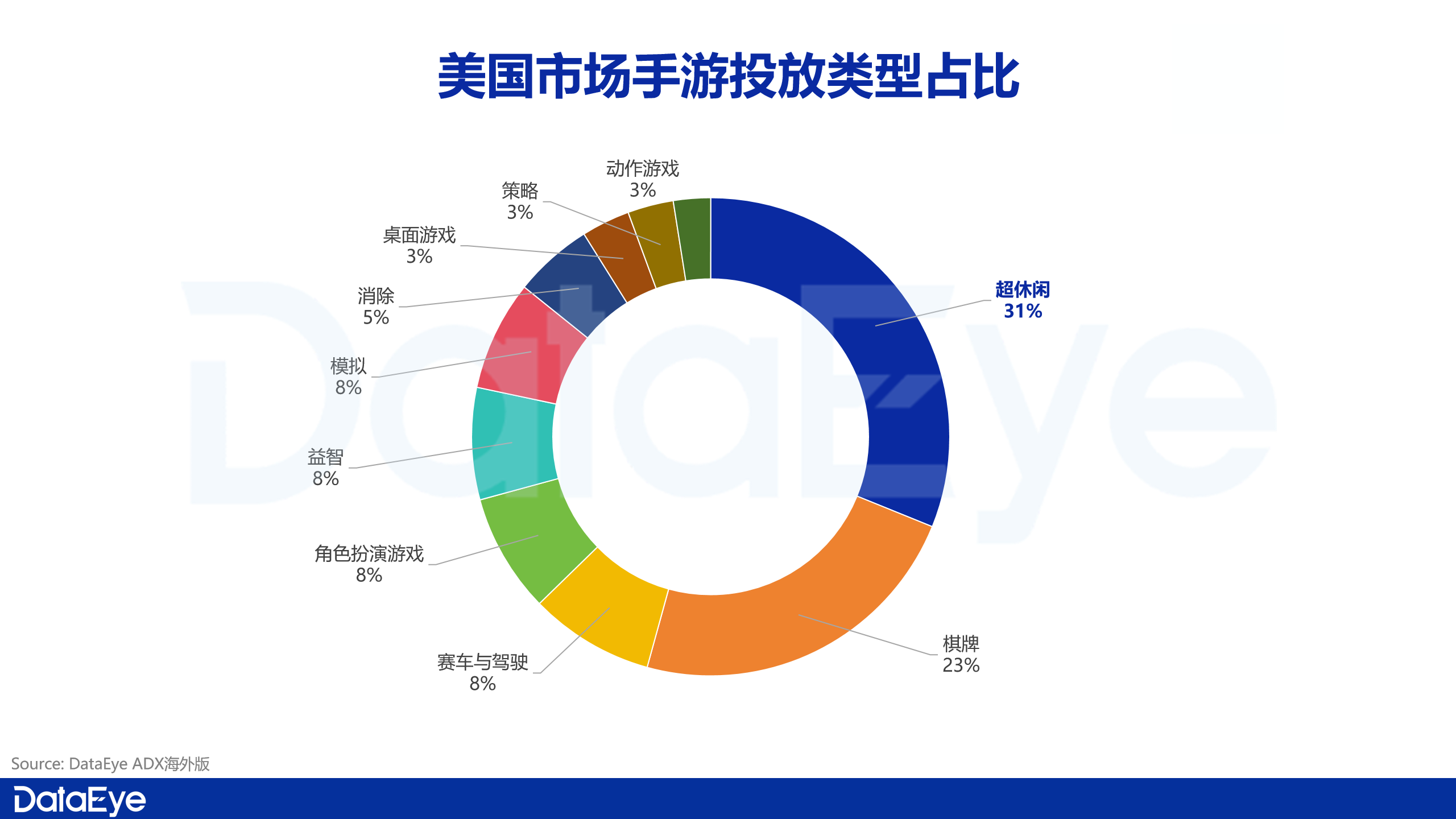 2025年美国市场手游投放类型分布依旧呈现出以轻度品类为核心、中重度品类补充的格局。超休闲游戏全年投放产品数超过2.1万款,占比达到31%。
