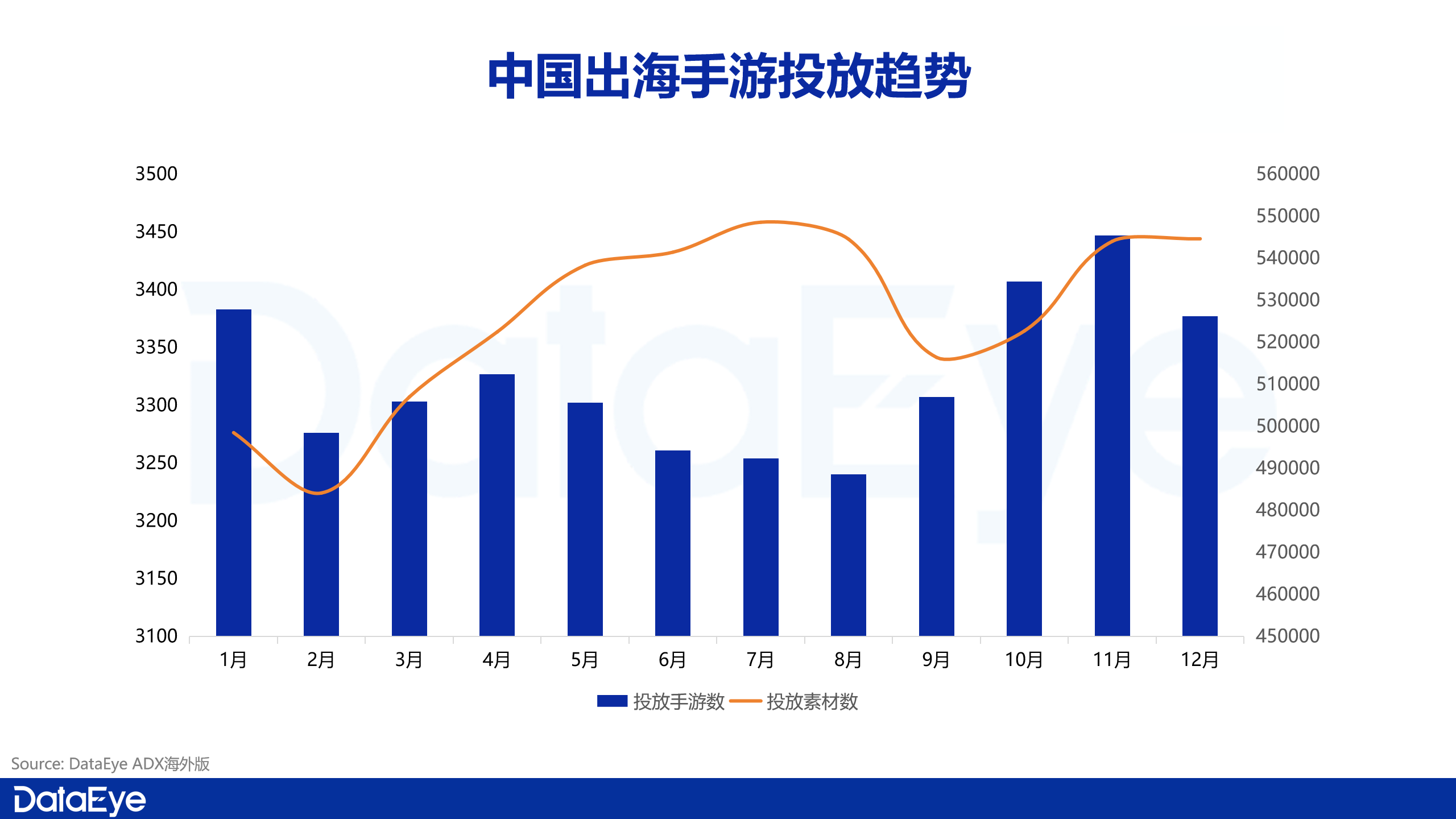 2025年出海手游投放数量整体保持稳定,单月投放手游数基本维持在3200–3400款区间,出海手游的单月素材投放量在全年维持在50万组以上的高位区间。