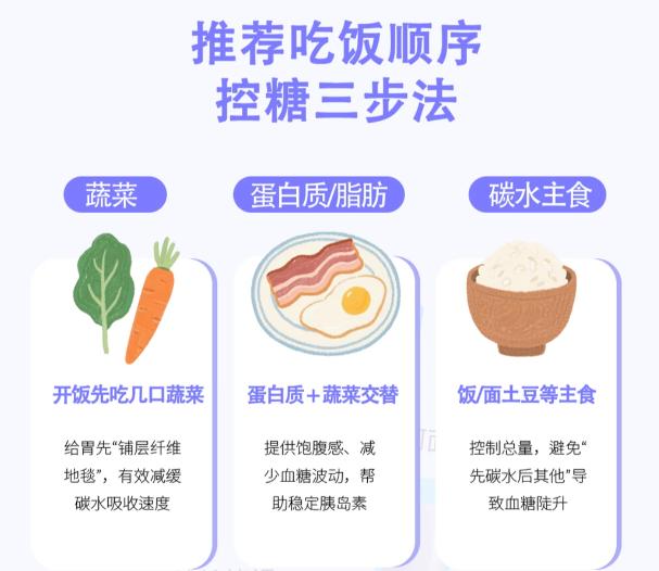 因此饮食控糖远不止是戒掉奶茶和蛋糕,真正的挑战在于如何稳住血糖,避免它大起大落,专家一般建议避免食用高升糖食物,或是改变进食顺序,先吃蔬菜和蛋白质最后再吃碳水,像设置路障一样让血糖平稳上升。