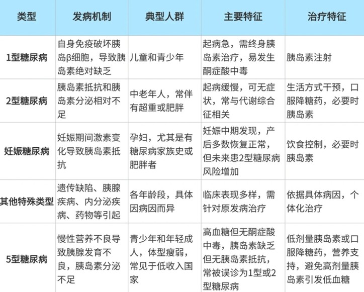 这里可以简单科普一下糖尿病的“家族成员”:1型(占5%左右,青少年为主,需要终身打胰岛素)、2型(占90%以上,中老年和肥胖人群高发)、妊娠期糖尿病(孕妇专属,产后大多能恢复,但会增加未来得2型风险)、特殊类型(各种罕见病因,占比不到1%)。2025年国际糖尿病联合会还认定了一个新的糖尿病类型:5型(长期营养不良引起)。