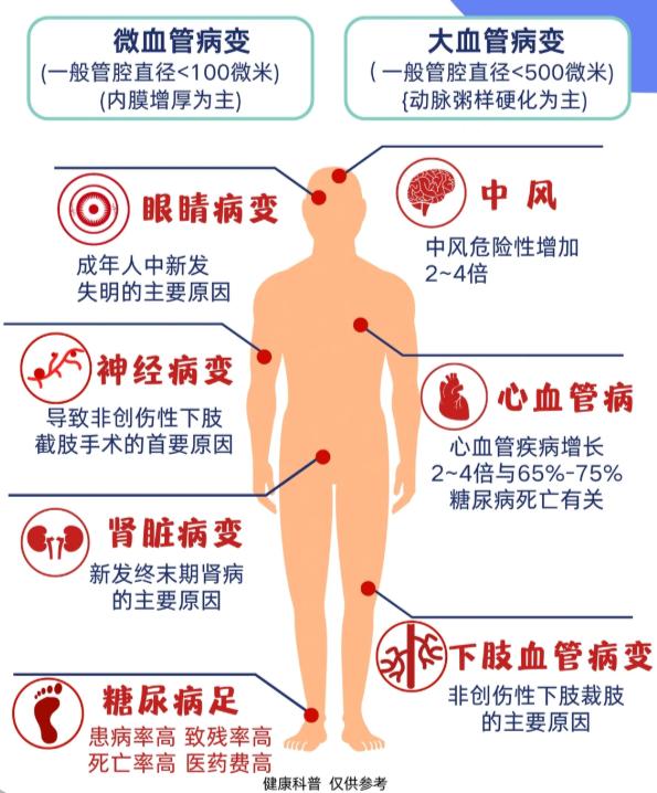 由于胰岛损伤不可逆转,一旦确诊糖尿病,等于基本告别“成为百岁老人”的美好愿望,病程超过10年的患者,出现并发症的几率高达98%。尽管糖尿病本身不致命,但并发症能把全身脏器“霍霍”个遍:视网膜的病变会悄悄偷视力,严重了直接失明;肾病会发展成尿毒症,只能靠透析续命;神经的病变让手脚变迟钝,小伤口也能拖成溃烂截肢,更别提心梗、脑梗这些突发风险,妥妥的全身精准打击。