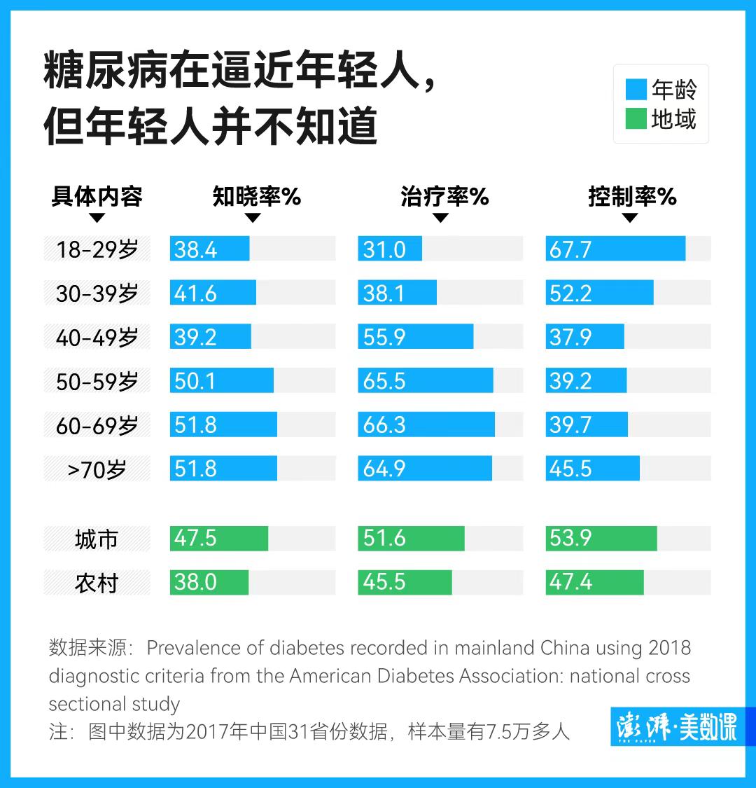 更让人焦虑的是年龄。以前我们总觉得糖尿病是老年病,现在糖尿病也吃上了“人口黑利”,开始向年轻人蔓延。研究显示,20-24岁年龄段的男性患病率已经达到7.42%,女性稍高,有7.52%,相当于这个年龄段每14个人里就有1个糖尿病患者。