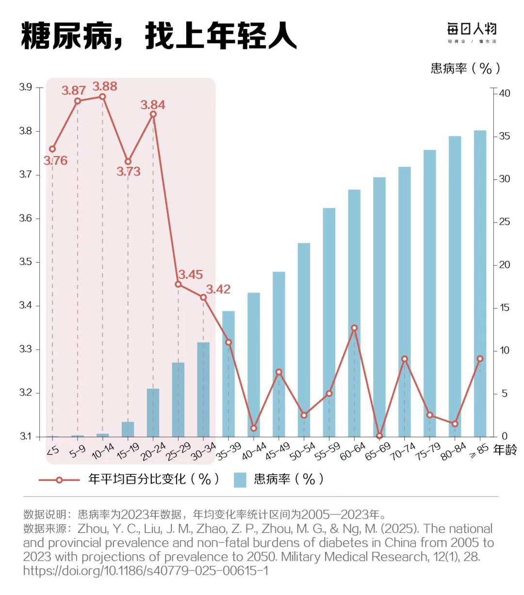从患病率增速来看,35岁以下的年轻人患病增速普遍高于3.4%,10-14岁的青少年群体患病率还在以每年3.88%的速度增长,这届10后还没开始打工,胰岛就已经终身罢工了。