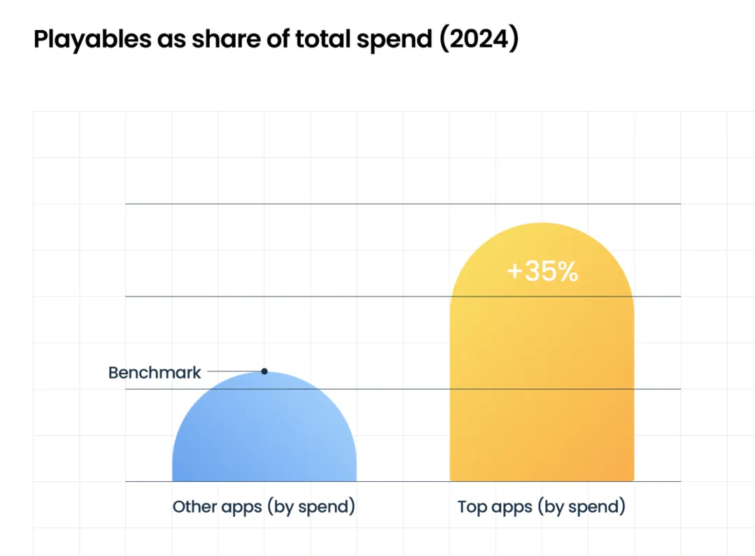 Liftoff的《2025移动广告创意指数报告》就提到,在2024年,畅销应用在可玩广告上投入的比重比其他广告形式高出约35%,并且可玩广告的“曝光到安装率(ITI)”表现明显强于非互动格式:对于非顶级广告主,ITI高达非可玩格式的16倍以上。这说明越来越多团队在投放组合中增加了互动格式的占比,并且这对获量的关键指标有明显提升。