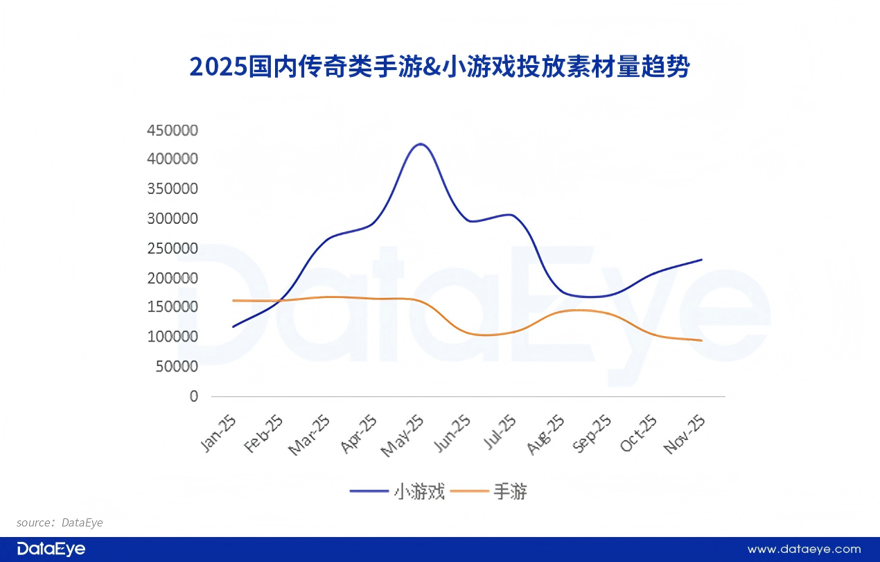 通过对传奇类游戏的投放趋势进行观察,传奇题材的投放素材格局在2025年发生较大的变化。传奇类手游买量素材量在2025年整体维持平稳,但总体投放素材量呈断崖式下滑,这反映出传奇类手游市场趋向饱和,获客难度加剧,相对来说,小游戏赛道已经成为传奇类游戏的抢量新战场,进而导致传奇小游戏投放量激增,基本上主导了传奇类游戏投放素材的整体格局。