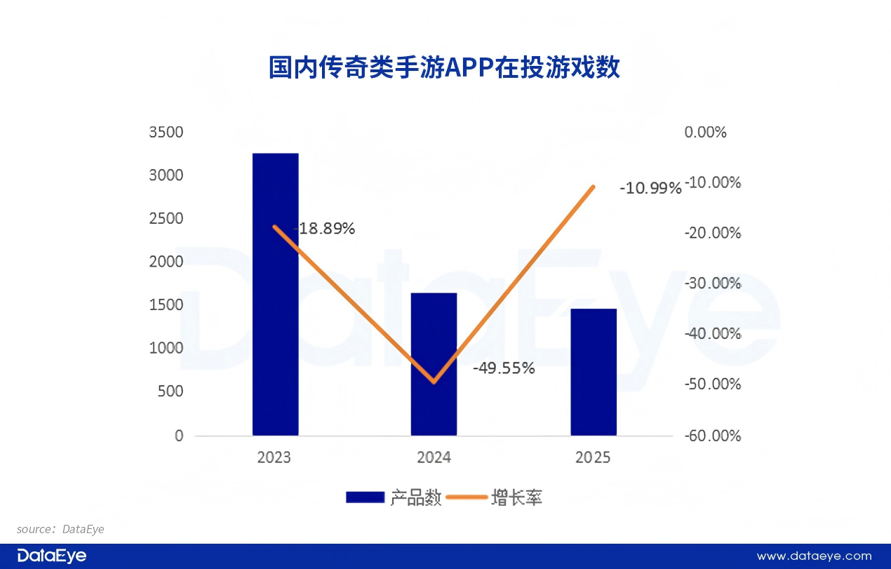 2025年传奇类手游在投游戏数呈现持续下滑的迹象,但降幅有所收窄。根据DataEye研究院统计,2025年传奇类手游在投游戏数约1450款,同比2024年下滑10%。另外,新增在投传奇类手游再创新低,全年新增在投游戏数约412款,同比下滑约34%。