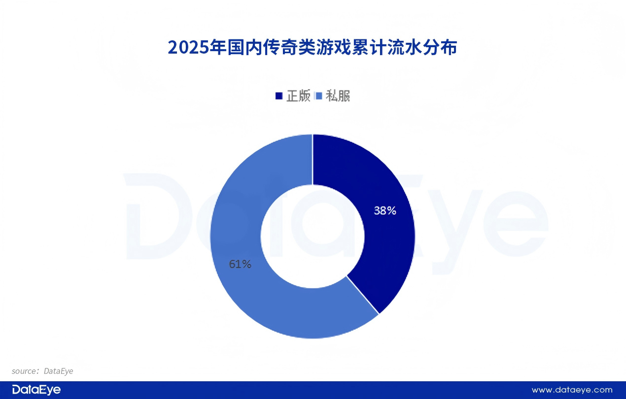 DataEye研究院基于公开数据推演估算,2025年传奇游戏累计流水达到4106.75亿元,正版游戏累计流水为1591.3亿元,占比约38.7%。而传奇私服游戏累计流水为2515.45亿元,为正版流水的1.58倍。