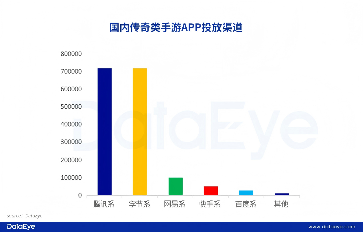 DataEye研究院统计,传奇类手游2025年投放渠道中,高度集中于腾讯系与字节系两大渠道,二者投放量基本持平,形成双雄争霸格局,共同主导传奇游戏买量市场。头部渠道与传奇游戏 30-39 岁男性核心用户高度匹配,且具备政策激励(如腾讯高分成)、场景适配(如字节直播带玩)等优势,转化效率突出。