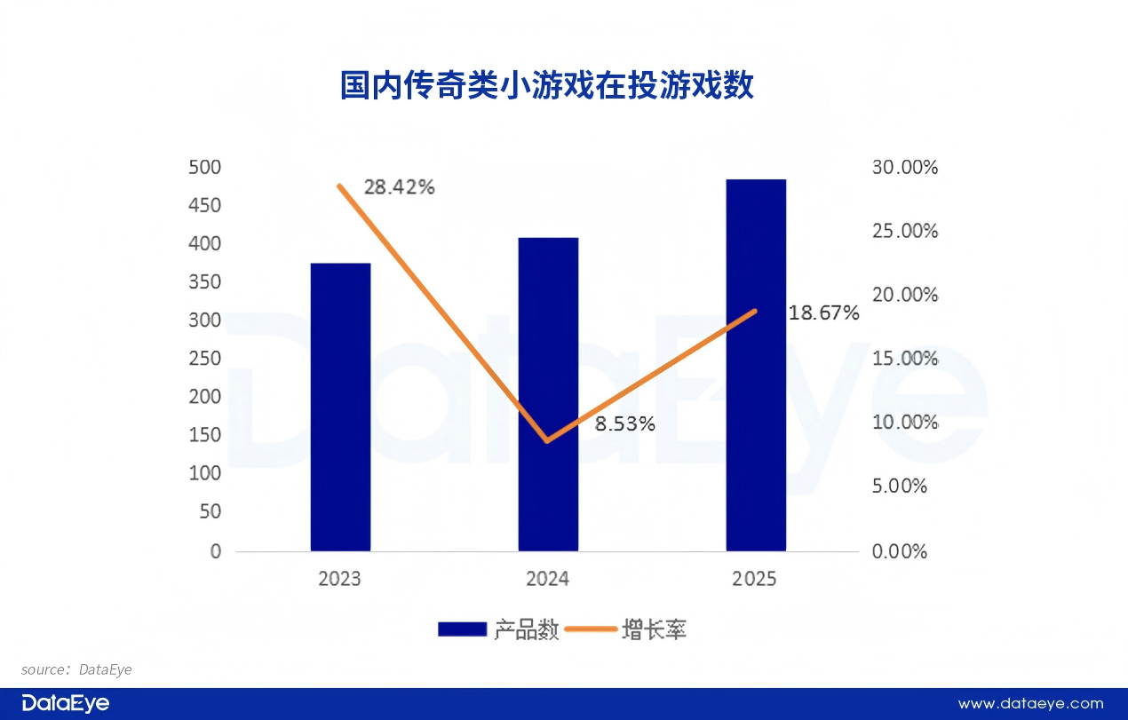 对比来说,传奇类小游戏在投游戏数自2023年开始实现连续上涨。DataEye研究院统计,2025年传奇类小游戏在投游戏数约480款,较2024年增长约18.67%。而且全年新增在投小游戏数149款,同比增长22.13%。
