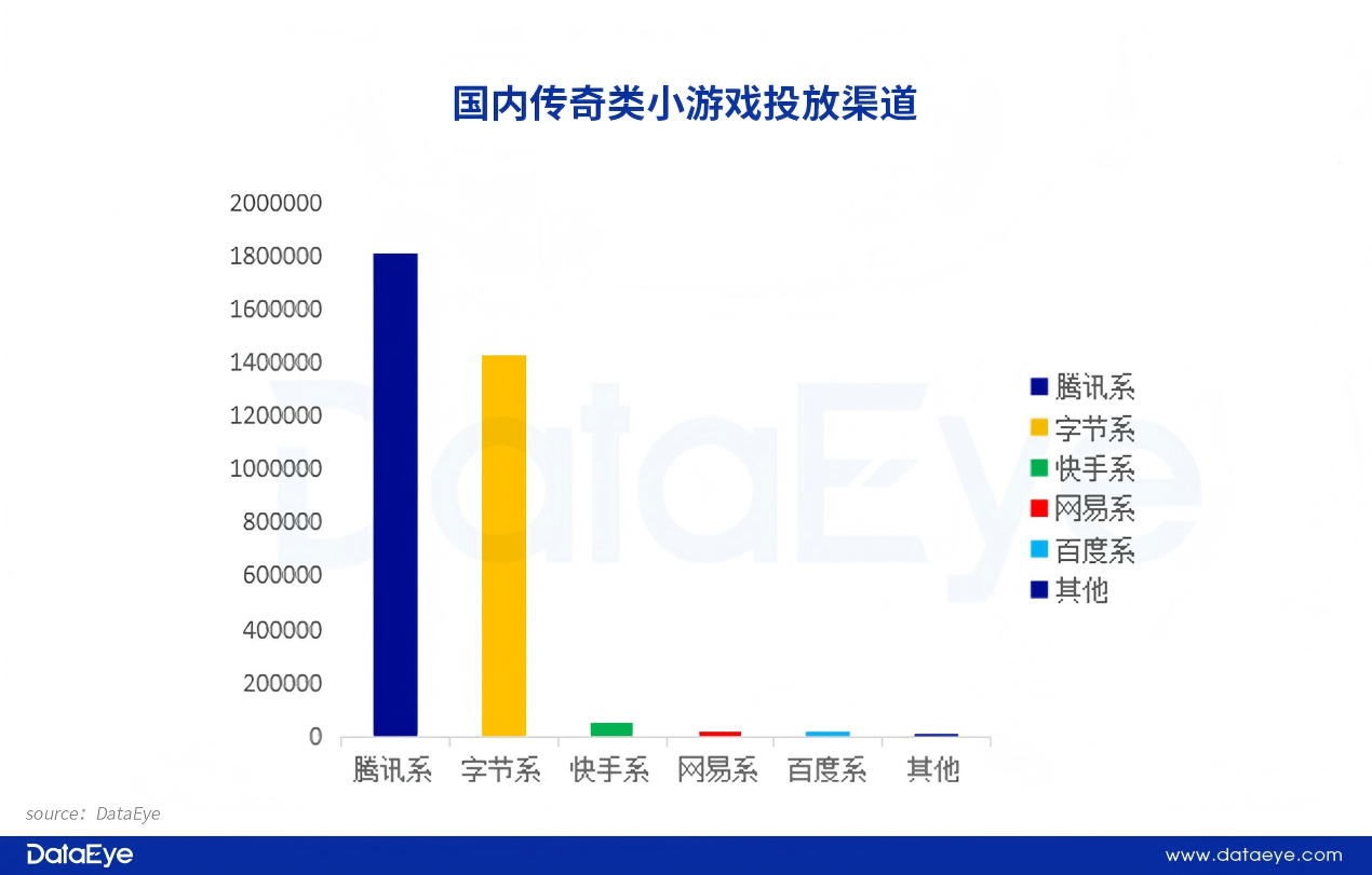 传奇类小游戏投放渠道同样呈现腾讯、字节双巨头垄断格局,形成绝对主导的二元结构,其他渠道影响力微乎其微。而在具体渠道分布上,但腾讯系占比更高,约为54%,这主要原因是在于腾讯超级APP应用+交裂变天然优势,小游戏生态闭环契合传奇游戏“碎片化 + 强社交”特性。
