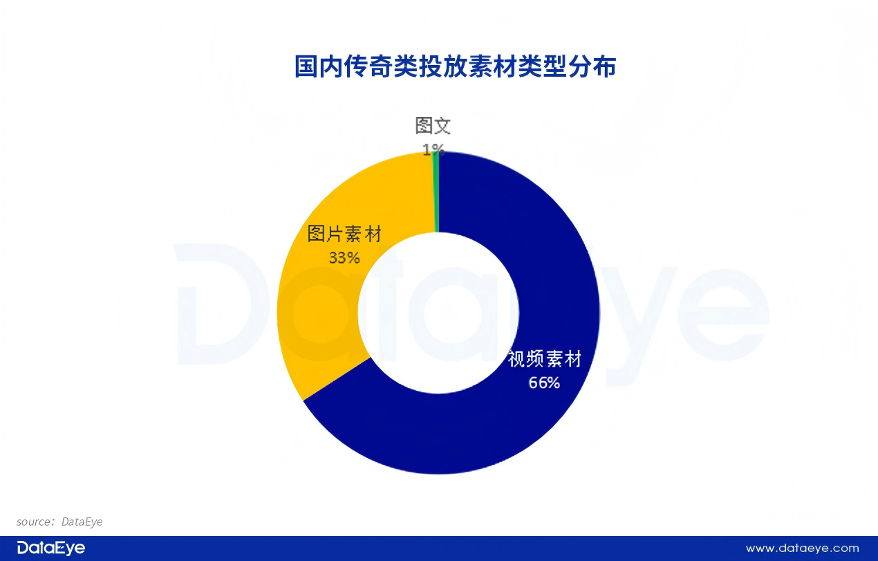 从素材类型占比来看,2025年传奇类游戏(手游+小游戏)投放素材中,视频类素材占比66%, 图片素材占比33%,图文(带BGM)素材占比仅有1%。传奇类游戏呈现“视频主导、图片补充、图文(带BGM)边缘化”的格局,核心源于视频素材对游戏卖点的强传递力与主流渠道的生态适配性,而近几年AI赋能下视频素材产出高效,提升了视频素材的内容参数,保证了传奇类游戏的素材库存。而图片凭借低成本优势承担补充曝光产品,图文(带BGM)整体体验割裂和性价比不足被厂商弃用。