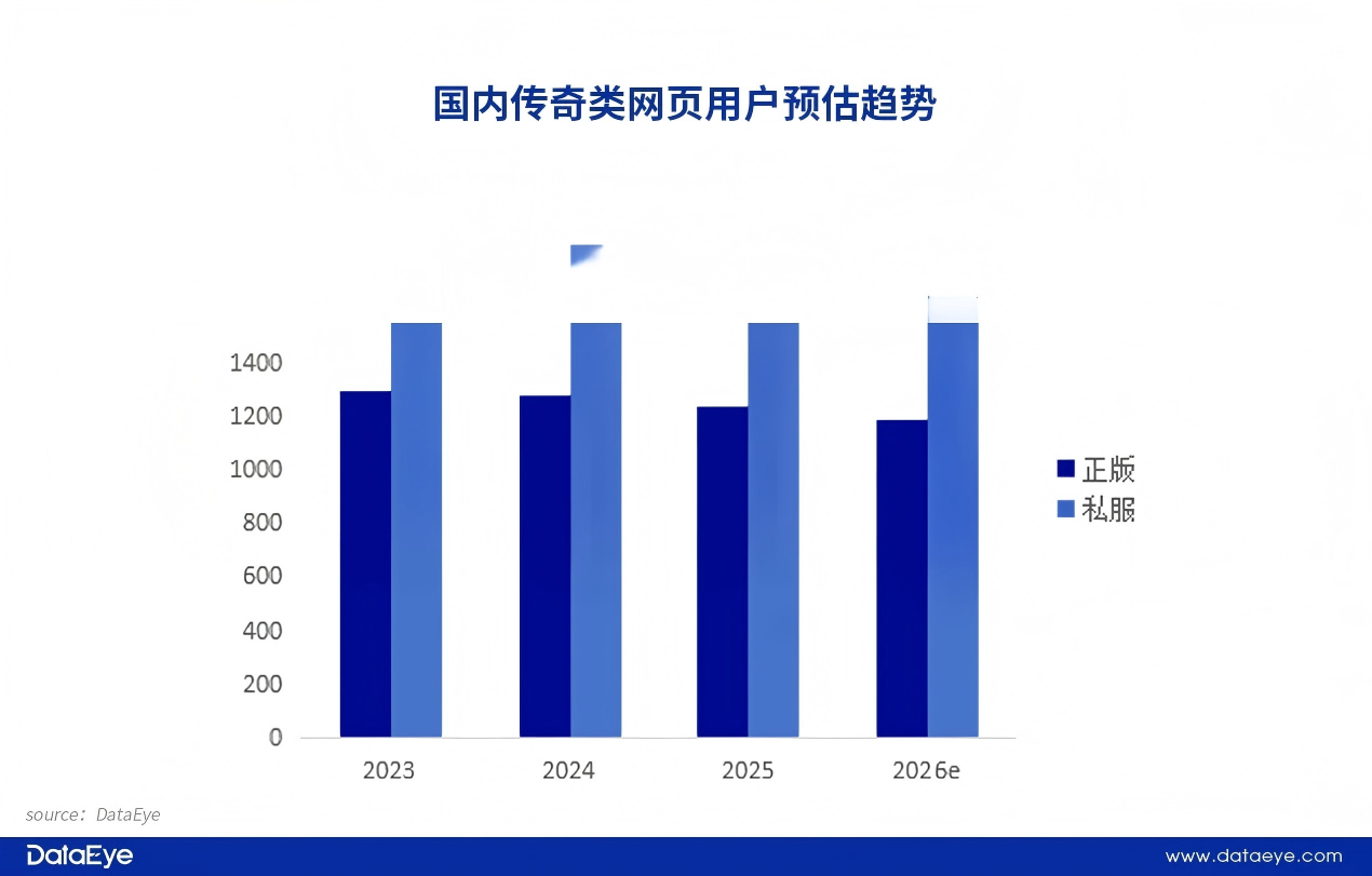 端游作为经典传奇IP的守护者,在2025年用户规模约为570万人,同比下滑1.7%。端游本身拥有提供原汁原味体验的产品优势,尤其吸引核心用户群体,而且这部分核心用户的忠诚度高,形成传奇类游戏的绝对基本盘。只是在时代浪潮下,移动端优势明显,端游用户规模逐渐下滑。可是值得注意的是,端游的正版用户呈现持续增长态势,私服用户逐年下滑。