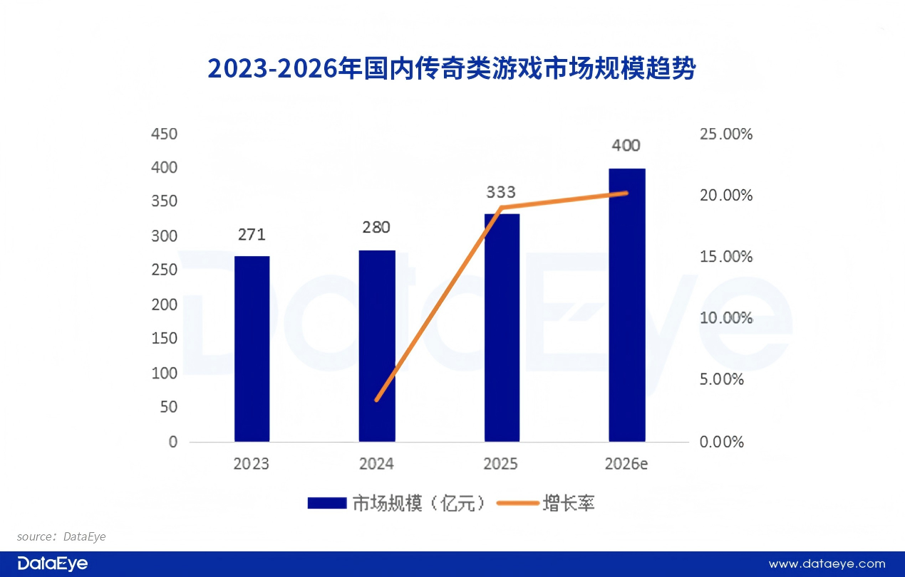 综合市场公开数据以及DataEye研究院预估数据显示,2025年传奇类游戏市场规模升至333亿元,同比增长18.93%。DataEye研究院认为,2026年传奇类游戏版权合规化影响力继续扩大,增速有望提升至20%,故2026年传奇类游戏市场规模估算数据有望突破400亿。