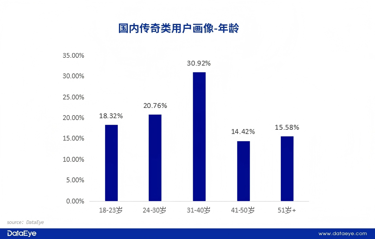 传奇类游戏的用户年龄分布呈现出以中青年为核心、覆盖全年龄段的鲜明特征,31-40岁群体以30.92%的占比成为绝对核心用户,30岁以下的年轻用户合计占比近四成,而41岁以上的中老年群体总占比超30%,这说明传奇类游戏整体形成了独特的“全龄化”用户生态。
