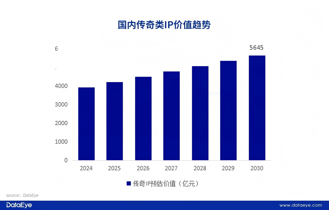 2001年上线的《热血传奇》为核心,历经20余年沉淀已构建起覆盖多领域的庞大价值生态。结合艾瑞咨询《2024年中国传奇游戏市场研究白皮书》估算数据显示,2001年至2023年传奇IP价值约为3647.8亿元。进入2024年后,受益于IP版权合规等因素,年平均产生价值预估升至285.3亿,因此在2030年传奇IP进入中国市场30年之际,传奇IP整体价值有望达到5645亿元。