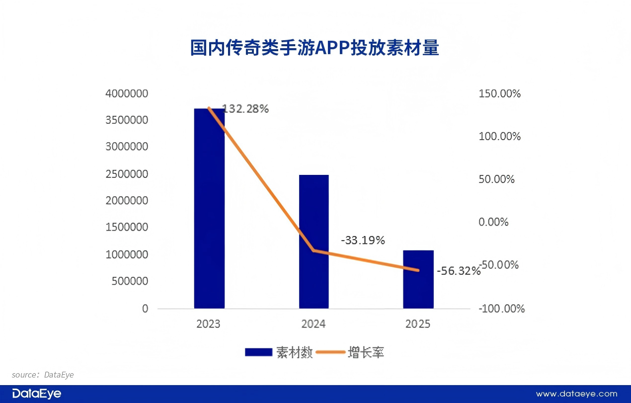 尽管传奇题材始终是游戏买量市场的重要品类,可基于市场竞争加剧,整体买量规模明显收缩。其中,传奇类手游的买量规模在2023年之后出现持续下滑的态势。根据DataEye研究院统计,2025年传奇类手游预估投放素材数108万,同比下滑56%。