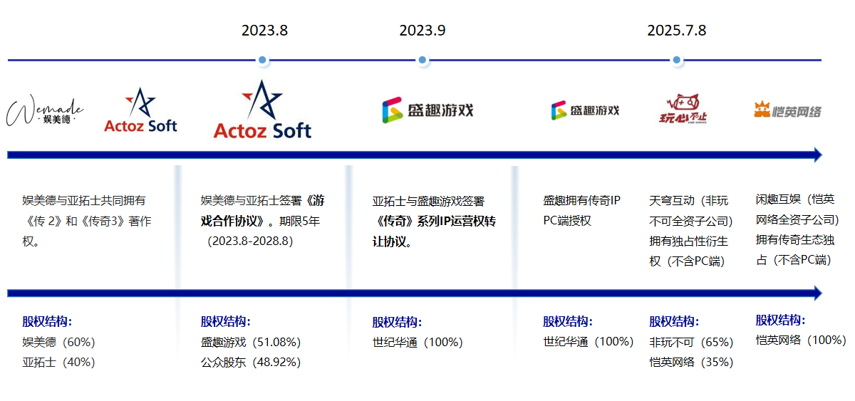 IP版权方(如盛趣游戏、亚拓士、娱美德等)居于核心地位,通过授权费与分成模式实现收益。目前国内传奇IP版权问题已经基本解决,具体如下:2023年8月,亚拓士与韩国娱美德签署了为期5年的《游戏合作协议》,协议明确了《传奇》游戏IP在中国大陆的权利归属,而盛趣游戏通过亚拓士继续保持对《传奇》系列IP在中国大陆的独占运营权;2025年7月8日,盛趣游戏正式与杭州天穹互动网络科技有限公司(玩心不止全资子公司)达成《传奇》及《传奇世界》IP 授权合作协议;同日天穹互动再与浙江闲趣互娱(恺英网络全资子公司)签署授权协议,授权其独家开发、运营、推广传奇盒子产品。