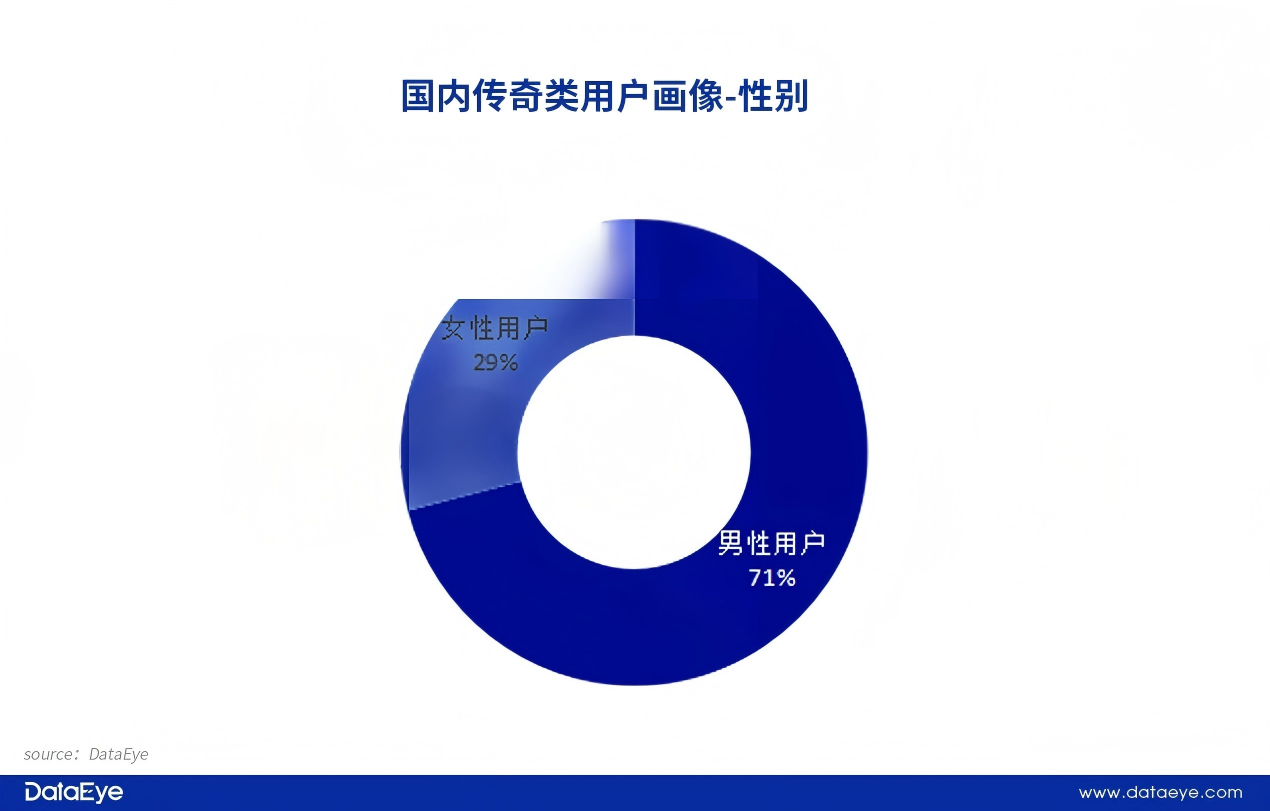 传奇游戏用户以男性为主,占比约71%以上,女性用户占比不足30%。这一特征与传奇游戏“热血 PK”“攻城战”等核心玩法的受众定位密切相关,但近年来随着游戏画面优化、社交玩法丰富以及女性向营销的推进,女性用户占比呈缓慢上升趋势。