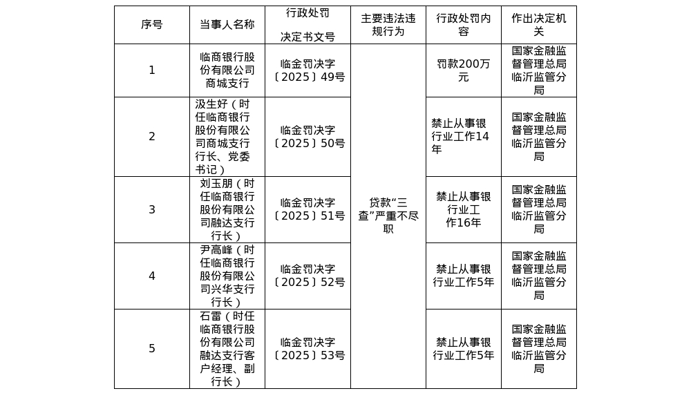 国家金融监督管理总局临沂监管分局于2026年1月5日向临商银行开出的一系列罚单,以合计340万元罚款、6名相关责任人被处以5年至16年不等的禁业处罚、时任总行副行长遭警告的严厉问责力度,彻底揭开了这家山东省城商行的信贷违规问题。